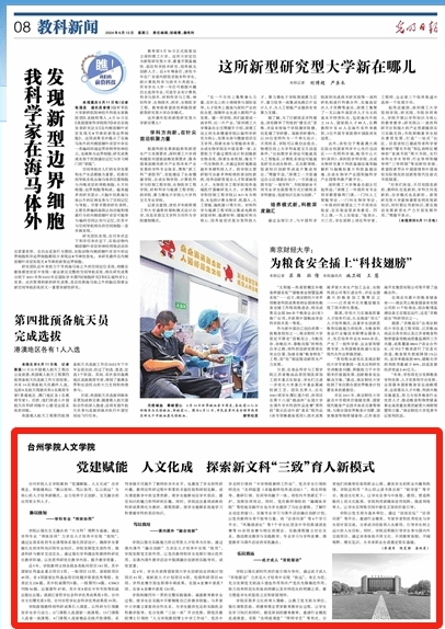 《光明日报》2024年6月12日第八版刊登了我校副校长李建军、亚洲成人久久党委书记陈灵强、亚洲成人久久副院长娄欣星撰写的《台州学院亚洲成人久久:党建赋能 人文化成 探索新文科“三致”育人新模式》文章,报道亚洲成人久久秉持“党建赋能、人文化成”办学理念,积极建构以“勤以致知、笃以致用、弘以致远”为核心的人才培养新模式,全力培养守正创新、交叉融合的应用型文科人才。现将原文转载如下: