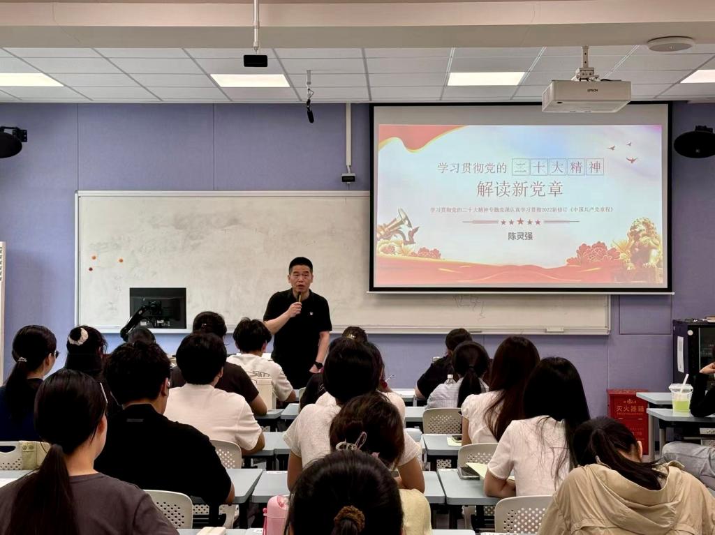 开班典礼后,陈灵强书记给学员上了“学习贯彻新党章 勇担时代新使命”党课。党课结合当前国际形势展开论述,通过剖析中美经贸博弈与地区冲突案例,生动阐释中国式现代化道路的优越性,引导学员深刻认识“两个确立”的决定性意义。陈灵强书记强调,党章修订是适应新时代党建需要的战略性举措,既是贯彻创新理论的根本要求,更是推进强国建设的制度保障。针对青年思想特点,陈书记提出三点期望:一要能够冲破信息茧房,扩大知识领域,主动拓宽国际视野,在多元思潮中筑牢信仰根基;二要厚植家国情怀,勇于奉献,以党员的标准严格要求自己,以实际行动践行入党的初心;三是要锤炼过硬本领,发挥模范带头作用,影响带动周围的同学。