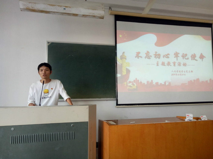 朗读后,六位学生党员谈了《习近平关于“不忘初心,牢记使命”重要论述摘编》的学习体会。同学们表示,共产党人在不同时期、不同的环境中,都践行着共产党人的“初心”和“使命”。初心是一种情怀,而使命是一种担当,作为大学生,在校时要学好专业知识,提高综合素养;作为学生党员,既要做好个人更要心系社会、国家,铭记当代大学生的家国情怀,不忘初心,坚守理想,脚踏实地,砥砺前行,助力“中国梦”。