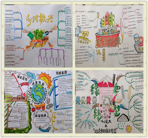 思维导图是一种图形思维工具,它运用图文并重的技巧,使主题关键词与图像、颜色等建立记忆链接,协助人们有效表达发散性思维。在本次思维导图比赛中,支部党员和入党积极分子们积极参与,他们围绕民生保障、绿色转型与乡村振兴等三大主题,开动脑筋,集思广益,绘制出一份份优秀的思维导图作品。