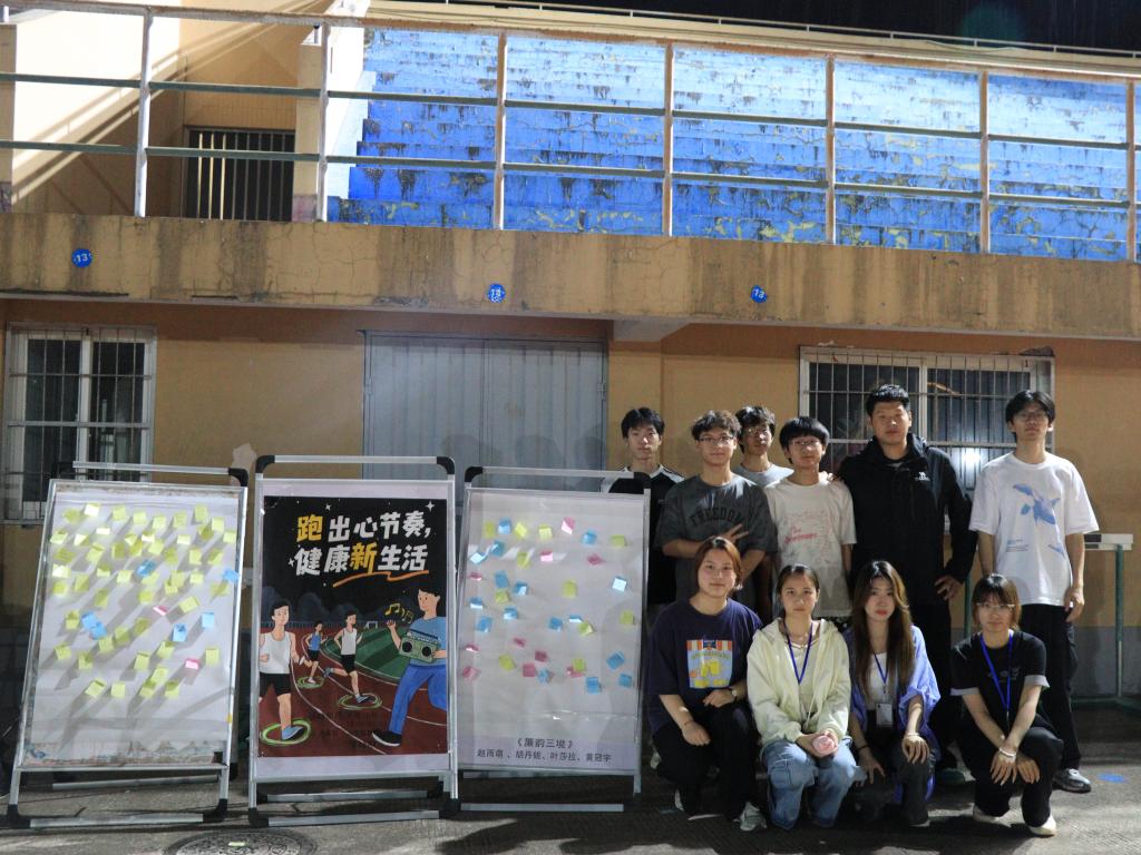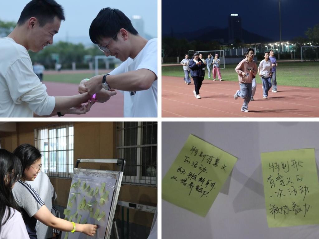 本次活动以“运动赋能心灵”为理念,参与者佩戴荧光手环,沿操场跑道完成夜跑任务后在便利贴上写下活动感受。活动任务设定为两公里,所有同学均跑满了全程。这两公里,对部分同学而言,是突破心理舒适区、克服惰性与怯懦的自我挑战;对另一部分同学而言,这是用坚持诠释坚韧品格,当疲惫来袭,凭借顽强意志实现对自我的心理超越;而对于全体参与者而言,这既是对健康生活方式的积极追寻,也是一次心理的自我疗愈与重塑。“本以为夜跑是孤独的,但和大家一起喊口号、互相加油,让我重新感受到集体的力量,感觉压力不知不觉就消散了!”正在写便利签的徐同学感慨道。