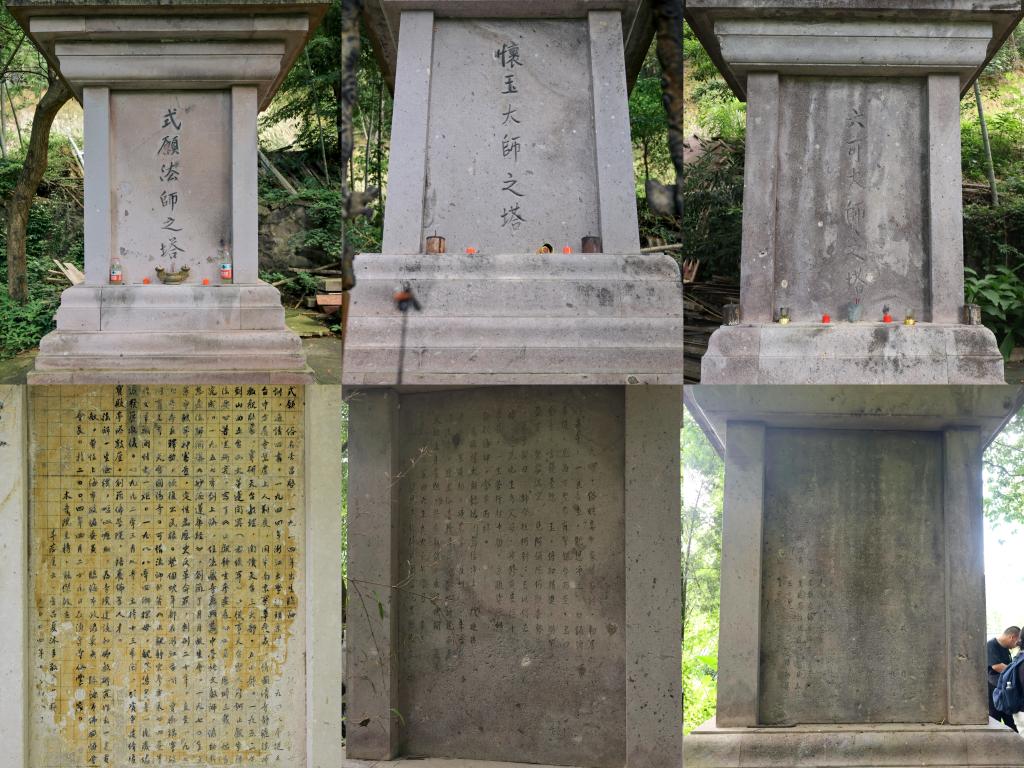 探索并未止步于地面建筑。经寺内僧人的指引,队员们穿过一条掩映于草木之中的小径,抵达一处静谧之地——这里矗立着由式愿法师、怀玉大师以及六可大师三人的塔组成的塔林。队员们仔细考察、认读了式愿法师塔身后镌刻的铭文,从而领略了一段有关于佛教文化存续与重生的珍贵往事。铭文有载:式愿晚年正值文革冲击后的中国佛教文化的复苏期,在个人佛学著作付之一炬、寺庙凋零的窘境下,他自发重建涌泉寺并引资创办佛学院,主动承担起了抢救与延续佛教文化命脉的重要责任。接着,队员们对另外两座塔也进行了细致入微的考察,深刻感受到了塔铭所承载的厚重历史。这些历经风霜的文字,无声地诉说着三位住持的生平事迹及其在佛教发展历程中的印记。