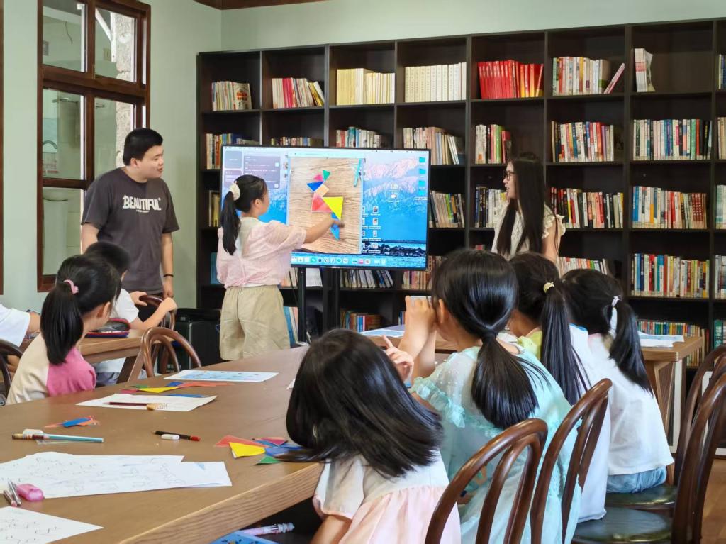 上午课程的主题是“七巧板”。看似简单的七块几何图形,却蕴含着无穷变化。课程伊始,队员们示范各种基础图形的拼法,引导孩子们认识七巧板的奇妙组合规律。随后,孩子们开动脑筋,在规定时间内拼出给定的图案,看似一个个简单的图案,拼起来却不是件易事。“还剩最后3分钟!”随着队员们的提醒,课堂里的气氛骤然紧张起来。孩子们盯着桌面上零散的七巧板,眉头紧锁,指尖在形状各异的板块间反复游移,空气里仿佛凝结着思考的火花。在自由拼搭环节,孩子们放飞想象力,不一会儿,形态各异的作品便诞生了:活泼可爱的小兔子、乘风破浪的帆船、巍峨耸立的城堡……每一个作品都凝聚着孩子们独特的创造力。此次七巧板课程,锻炼了孩子们的动手能力、空间思维能力与团队协作精神,也让他们领略到传统益智玩具的独特魅力 。