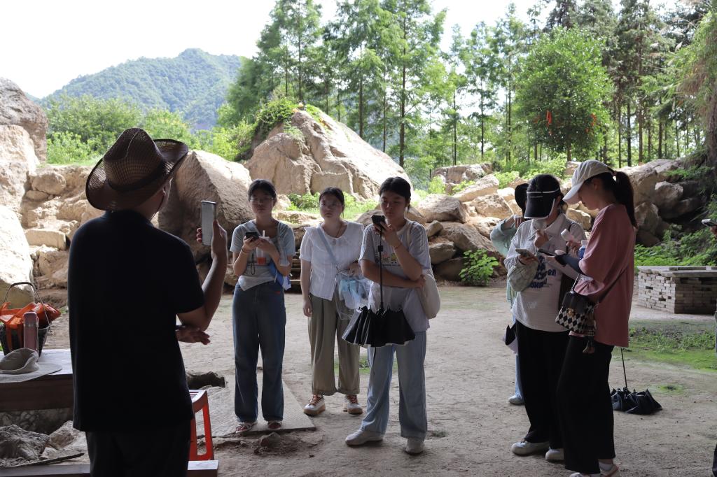 离开明岩古寺后,实践队到达最后一站寒岩洞。队员们自山脚拾级而上,山腰处“别有洞天”。寒岩洞是一处喀斯特地貌天然洞穴,因“和合二仙”之一的寒山子曾在此隐居七十余年而得名。