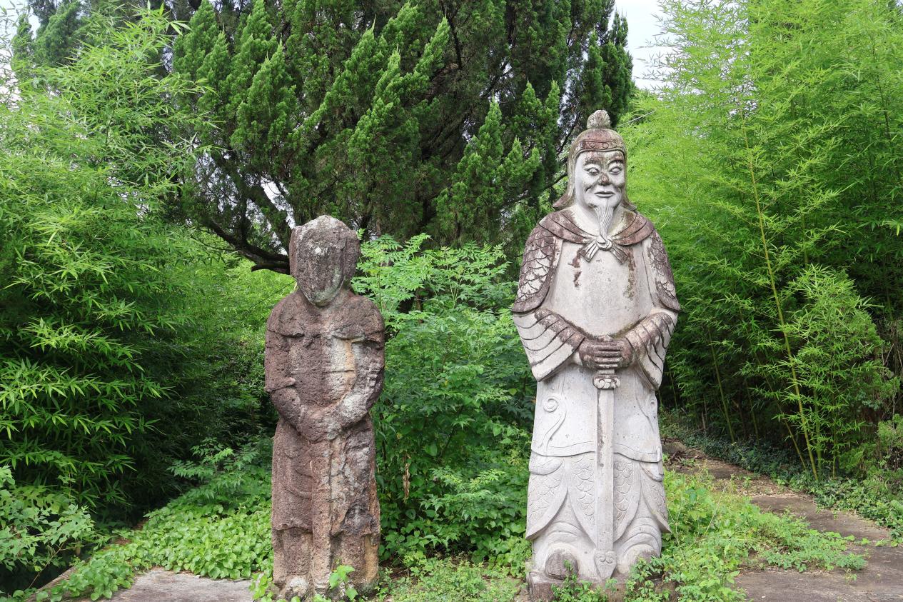 上午9时许,团队成员抵达临海市白水洋镇水晶坦村,在指导老师苏卢健的指引下,队员们顺利找到了位于山下的谢深甫墓。该墓规模宏大、庄严肃穆,墓前有牌坊,前额书“济世爱众”,后额书“清风峻节”。墓道两旁摆列着石像生,其中一对石马、一尊文官像和一尊武官像是南宋时期的旧物,石马没有脑袋,武官面容模糊。因后人感念其德,遂为谢深甫墓进行了修缮,故旧像旁立着新的石像。