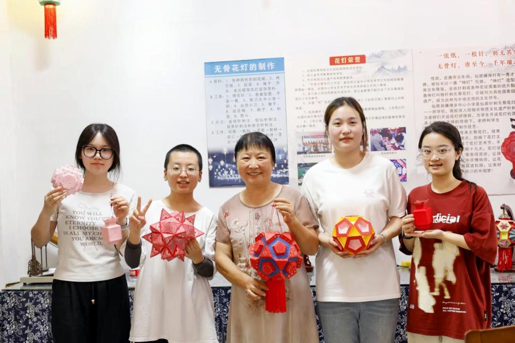 师生们一进入工作室,就被眼前一盏盏在光影中流转的花灯所吸引。据方荷玉介绍,仙居针刺无骨花灯相传起源于唐朝,与一则孝子传说息息相关:秀才为母采药迷路,得到仙女提灯指引,归来后众人将此灯称为“花灯”;后来秀才中状元,灯又得名“状元灯”。这则带着温情与奇幻色彩的故事,让花灯自诞生起便浸润着慈孝与吉祥的寓意。