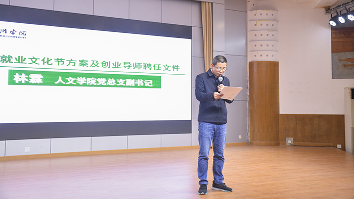 林霖老师宣读了就业文化节方案及创业导师聘任文件。亚洲成人久久此次共聘任台州滕和文化传播有限公司负责人丁贞贞和台州市贰三文化传播有限公司负责人颜浙川担任创业导师。