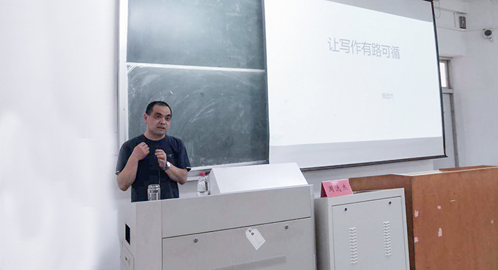周选杰以语文写作教学的现状发问,引发同学思考。他认为写作有三大要点,分别是写作关系、写作程序和写作知识。周选杰以“家乡”主题的写作为例,强调写作中应理清“对象、作者、表达”等要素的实质关系;他结合马斯洛需求理论,阐述了写作过程中建立关系、借助知识成文、评价与修改、展示、发布等一系列程序;他提出“描写就是带着感情描摹你所‘看见’的东西。”指出“描写形式可灵活、叙事框架可简明”,从而使文章更加生动。周选杰还分享了中学写作教学时间安排表,表示今天的讲座内容只是教育探索中的小成果,同学们写作教学的路仍然漫长,每个人都需做个不断探索的“有心人”。他还向同学们推荐书籍《让写作有路可循》,列举初中各年级写作方法,为同学们提供学习的方法。