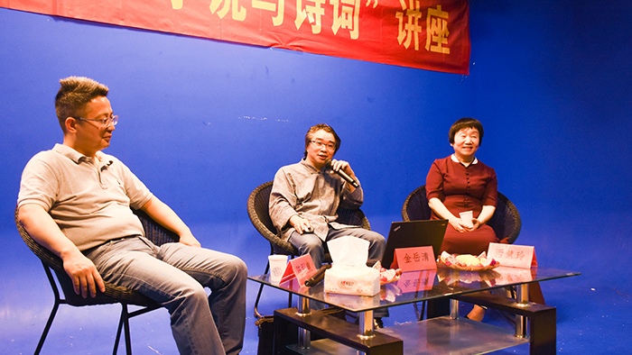 提问环节中,同学们踊跃发言。陈引奭馆长解答了是诗歌创作中格律重要还是意蕴重要,平水韵和中华诗韵两者如何取舍等问题。金岳清主席回答了草根作家何以寻“根”、创作过程中容易走偏等问题。