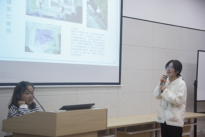决赛现场,各寝室讲解人采用ppt与解说相结合的方式,展现寝室风采。其中,16-309寝室通过展现“童趣彩绘”“情感加油”“五彩纸鹤”“白纱漫舞”“绿植有染”五个寝室特色,达到追求美好温馨、健康向上的生活目标。5-1301-01寝室特以“无聊斋”为名,梅兰竹菊墙画古朴清新,傲然挺立,平添诗情画意,追求“此时无声胜有声”的心灵默契。名为“魔法屋”的5-3502-04寝室中精致的装饰物件引人注目,尤其是手工拼搭的书架“小绿”为寝室增添了浓厚的书卷气息,营造了良好的学习氛围。为缓和比赛过程的刺激紧张,现场特设游戏环节,欢声笑语不断。经过激烈角逐,5-3502-04寝室荣获一等奖,17-407、16-309、5-1201-02获二等奖,5-3401-03、5-1301-01、5-1102-02、5-1101-01获三等奖。