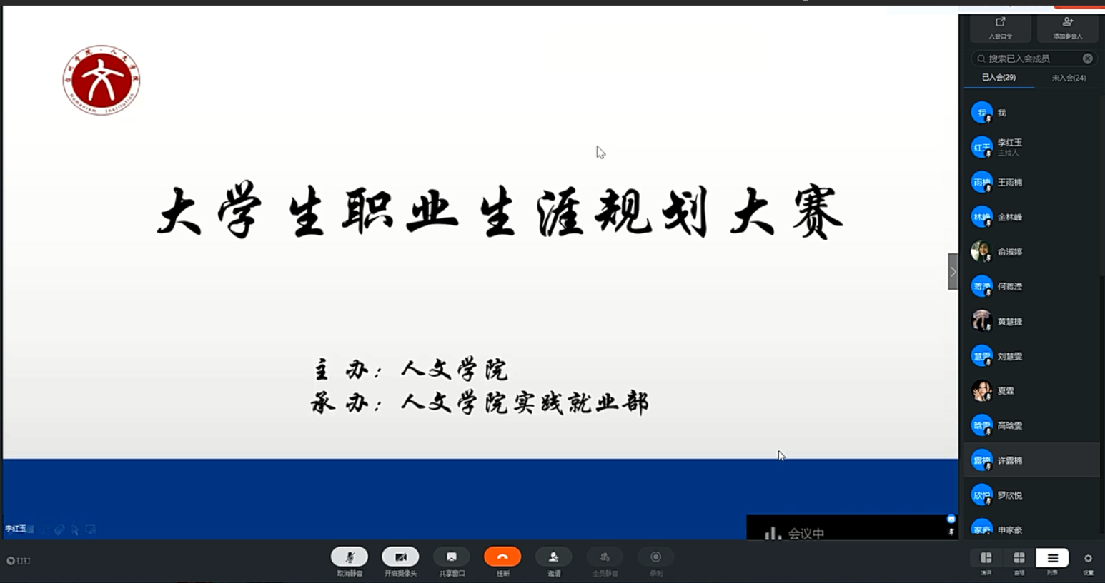 5月16日晚,由亚洲成人久久主办、实践就业部承办的大学生职业生涯规划大赛在线上展开。亚洲成人久久党总支副书记林仙,辅导员高晗雯、夏文杰、姚卓琳老师应邀担任本次活动的评委。部分对职业生涯规划大赛感兴趣的人文学子观摩了本次大赛。