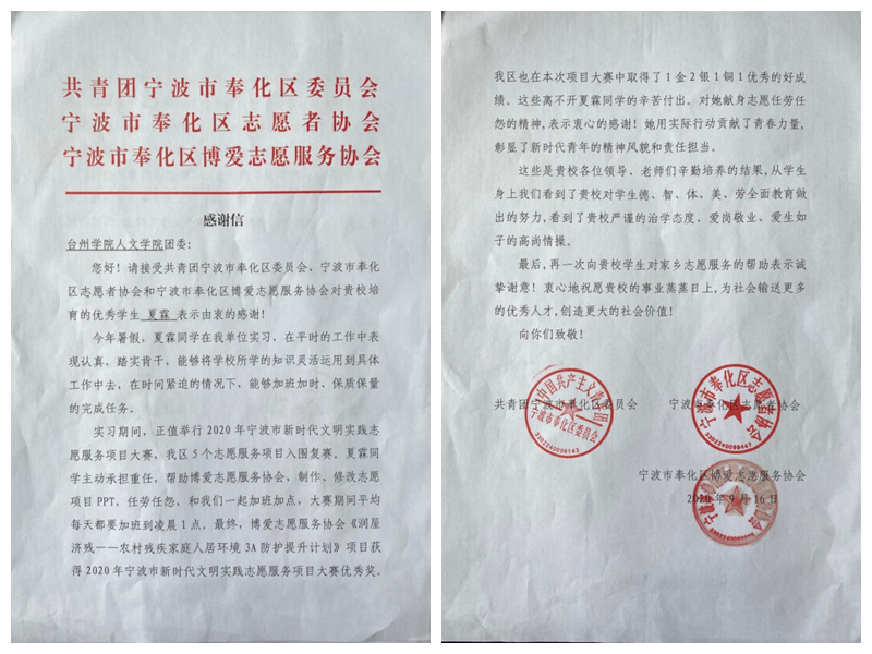 今年暑假,夏霖同学积极参与奉化团区委与志愿者协会的工作,实习期间,正值举行2020年宁波市新时代文明实践志愿服务项目大赛,夏霖同学主动承担重任,帮助博爱志愿服务协会,制作、修改项目汇报PPT,和工作人员一起加班加点,大赛期间平均每天都要加班至凌晨一点。最终,她参与的志愿项目《润屋济残——农村残疾家庭人居环境3A防护提升计划》项目获得2020年宁波市新时代文明实践志愿服务项目大赛优秀奖,同时,所在的奉化区在本次项目大赛中取得1金2银1铜1优秀的历史最好成绩。