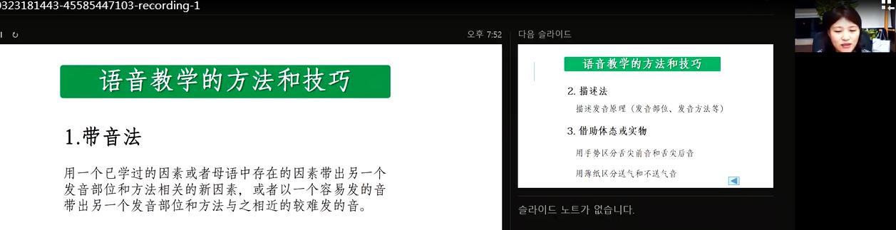 玄贞姬老师从带音法、描述法、体态及实物运用法、夸张法、对比法5种教学方法展开说明了对外汉语语音教学方法,并运用大量实际教学案例进行了教学演示。从直接法、旧词带新法、近义-反义词举例法、语素释义法、语义关系法、语法扩展法、形象释义模拟演示法、情景释义法、翻译法、图形符号法、归纳比较法等11教学方法展开说明了对外汉语词汇教学方法,并通过实际教学案例进行了演示。对外汉语语法教学分享中,玄老师强调不要讲显性的语法规则和语法知识,要讲阴性的语法知识和语法规则。不能大讲语法,要做到“手中无剑,心中有剑”,“不讲语法,可心中存留了语法”的境界。从形式和意义并重法,结构、语义、语用三者得体法,归纳法+体验法等3种方法着手,为学生们展开说明了教学案例,并且对遗漏偏误和误加偏误进行了教学案例说明。