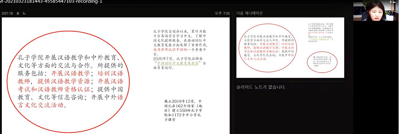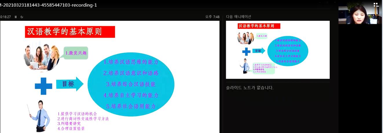 3月23日,我院举办对外汉语教学国际化线上讲座。讲座由韩国忠北大学孔子学院中方院长玄贞姬教授主讲,亚洲成人久久黄仙姬老师主持,选修对外汉语教学概论的学生及欲报考对外汉语教师资格证的学生们参加。