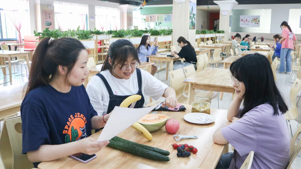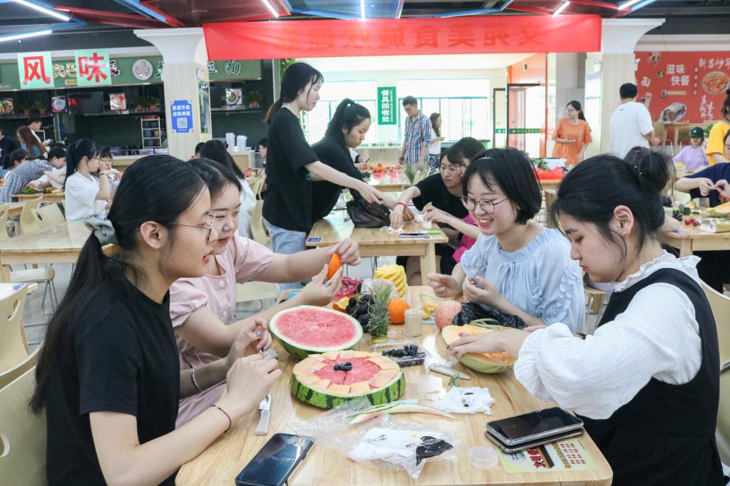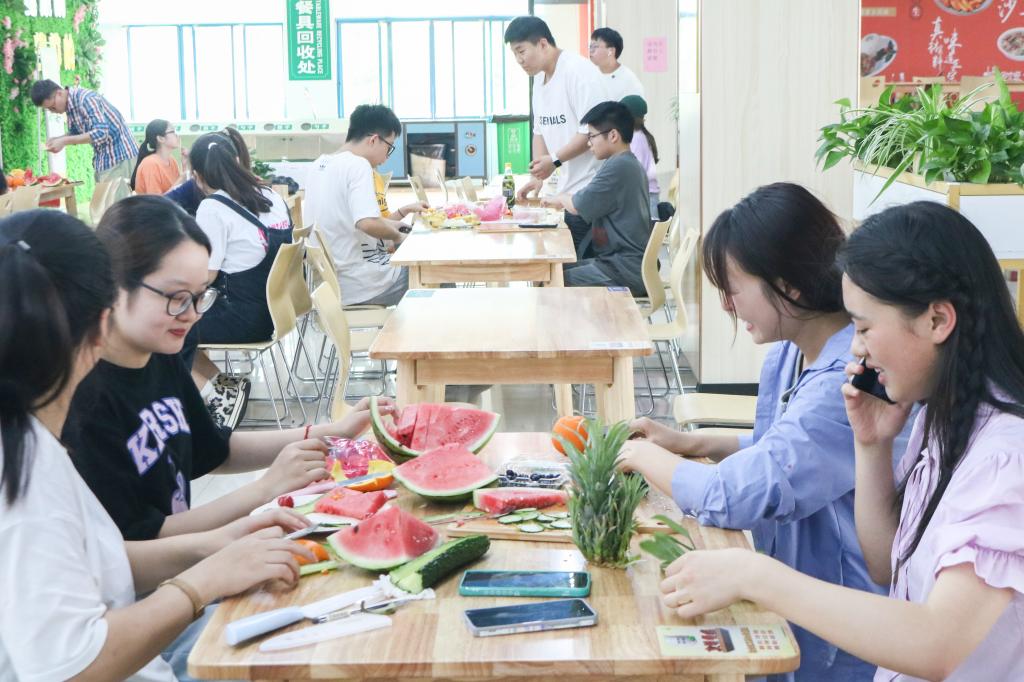 比赛中,参赛选手们有条不紊地用巧手搭造着“盘中景致”。有的小组将水果刻成不同的形状,可爱又简单;有的小组将水果铺满一层又一层,仿佛是不同的水果在开狂欢派对;有的小组将水果串成不同的绿植状,构成“春风送暖万物复苏”的图画;有的小组展现冬天的风景,为炎热的夏日增添一抹清凉。