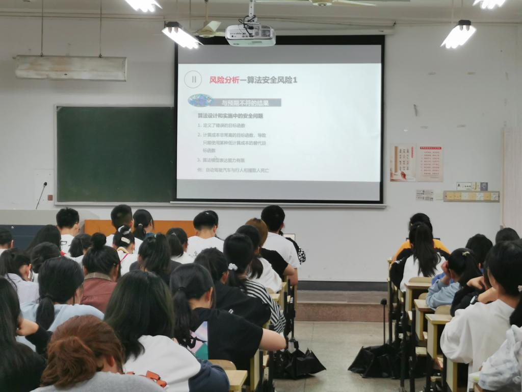 讲座伊始,徐明教授从“什么是个人信息”“信息如何泄露”“如何保护信息”“如何合法使用信息”以及“违法案例”这五个方面展开针对“个人信息保护”这个话题的论述。徐明教授从个人信息泄露的案例进行分析讲解,提醒同学们使用APP时需注意权限设置,谨慎连接公共WiFi,尽量避免扫描来源不明的二维码等。另外,徐教授向学生们普及了网络安全基本知识,提醒同学们上网需增强防范意识,并在“智能安全与安全智能”这一问题上,以丰富的图片来讲解人工智能原理,用辩证的思维向学生们阐述了人工智能的利弊。