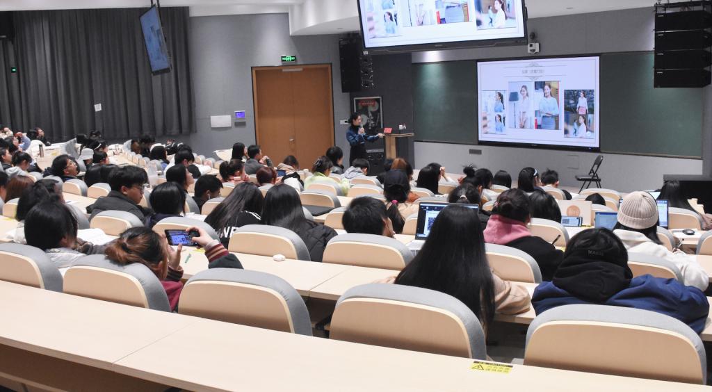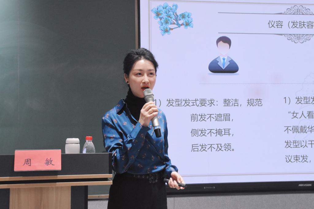 周敏老师围绕“礼仪概述、职业形象、社交礼仪、职场礼仪”等四个方面进行详细介绍。首先,周老师强调礼仪来源于人类社会,并随着人类文明的发展而丰富变化。礼仪是人际交往的艺术,是有效的沟通技巧,也是约定俗成的行为规范。其次,在职业形象方面,周老师提出了仪容、仪表、仪态的有关规范。关于仪容,女生是“妆成有却无”,男生是整洁规范;关于仪表,要注重身份场合、整体协调、个性化以及整洁四个原则;关于仪态,坐、立、行皆有程式,周老师一一进行了现场示范。第三,周老师还就会面礼仪、握手礼仪、名片礼仪、位次礼仪等职场和社交礼仪进行了仔细的讲解和规范的展示。最后,周老师希望在以后的学习、生活和工作中,同学们能知礼、懂礼、习礼、用礼,在外应对得体、谈吐优雅、穿着整洁,在各类场合都能从容自信。