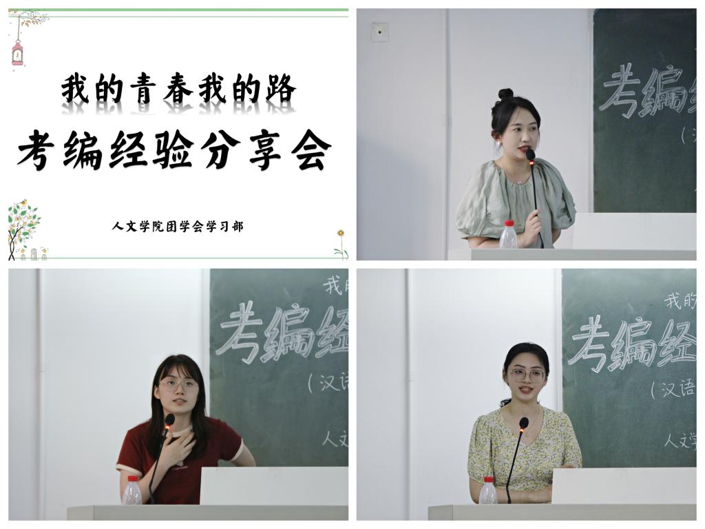 6月14日晚,由人文团学学习部承办的“我的青春我的路”考编经验分享会(汉语言文学专场)于临海校区1306教室举行。活动邀请到18级考编上岸的夏霖、陈可心、马卓羽学姐分享考编经验,部分中教、中文专业学生参加本次活动。