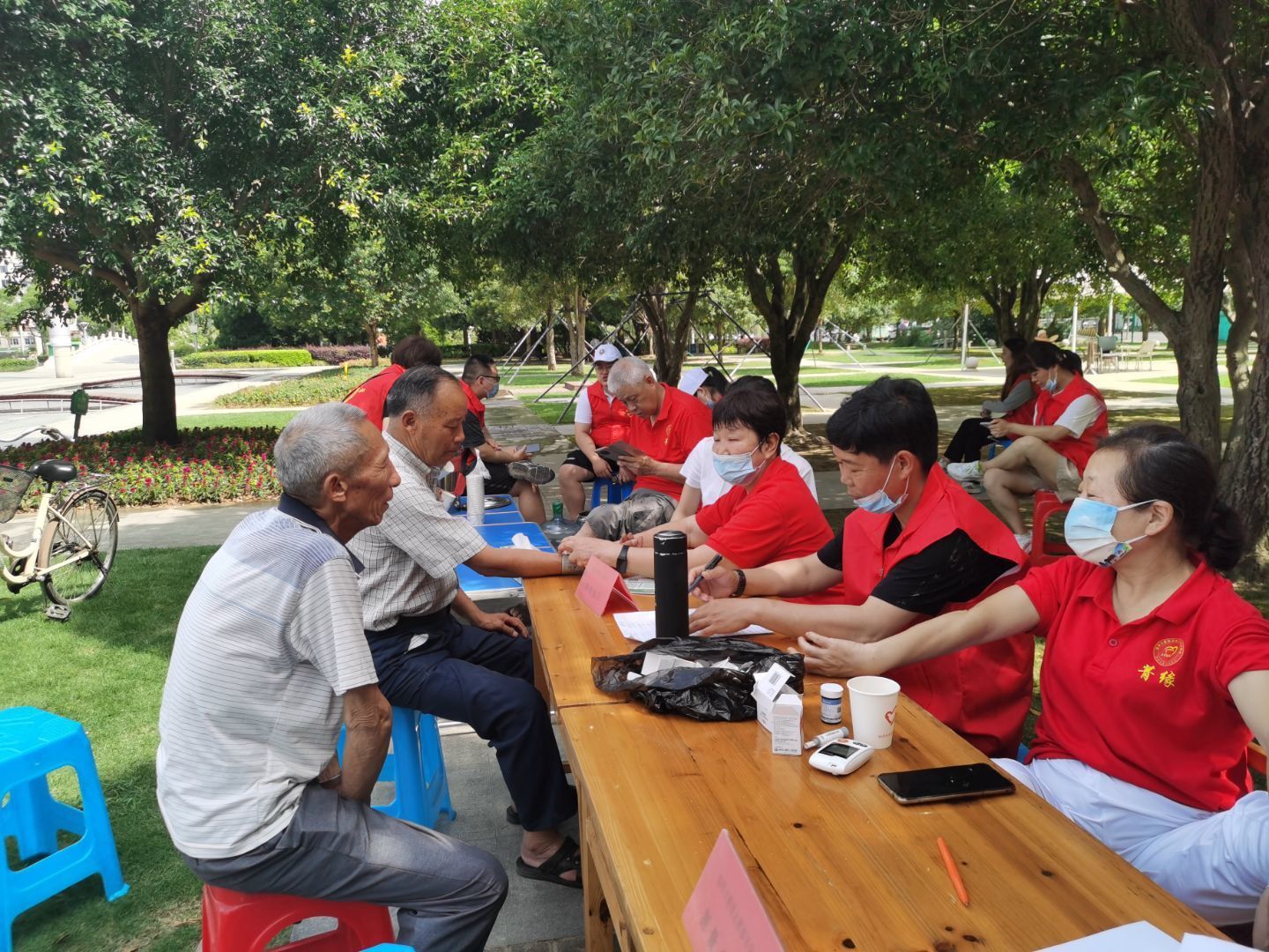 在33摄氏度的高温下,法律新风进万家实践队队员为在等待中的老人们赠送爱心凉茶。与此同时,法律新风进万家实践队还对市政广场进行了美化,旨在为老人们的日常锻炼与活动提供一个更为舒适整洁的场所。