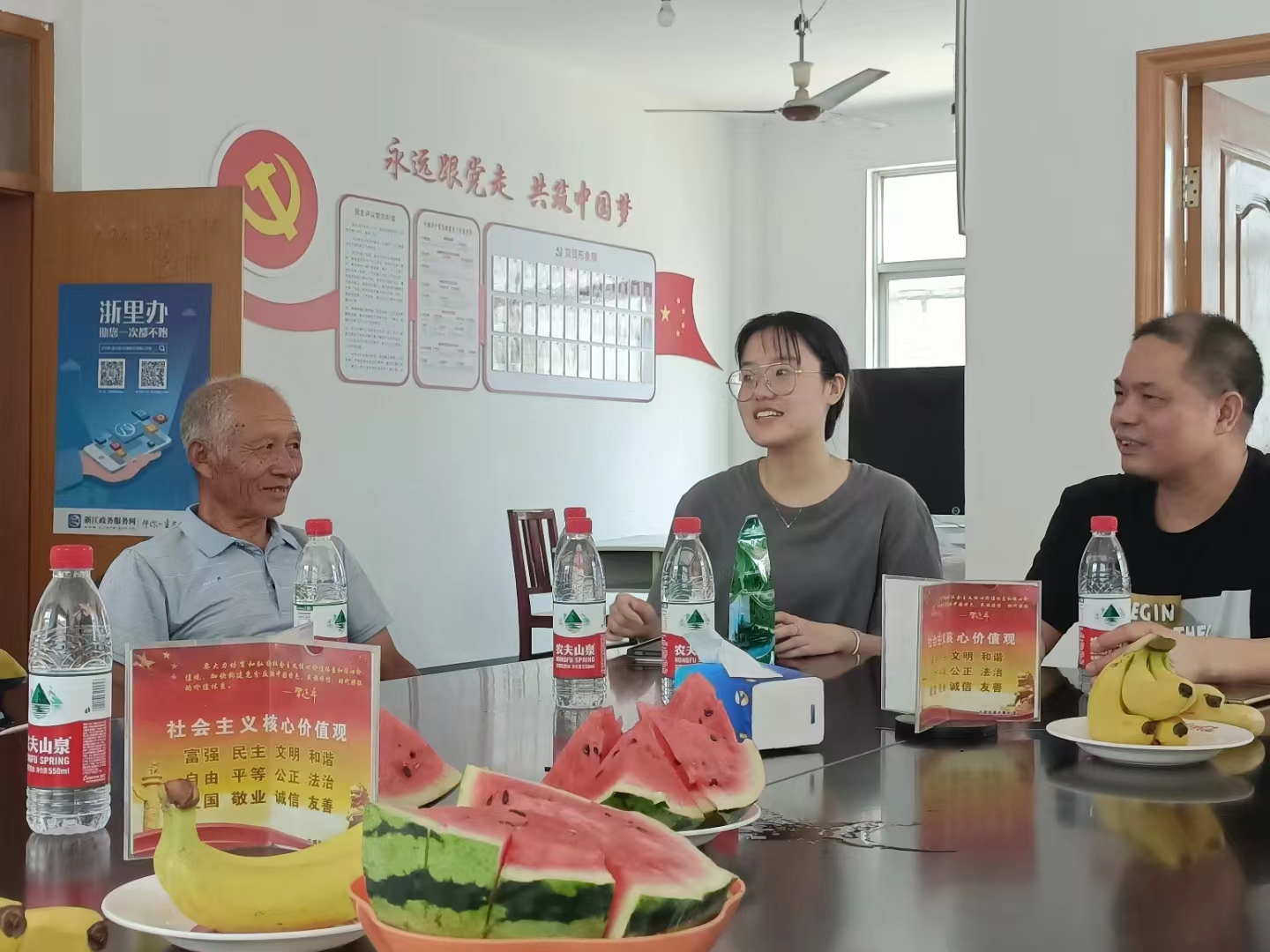 随后在单仁慰和王妮老师的带领下,实践队队员来到了临海农业农村局,单老师向李建强副局长表达了台州学院目前对涌泉蜜桔进行农业文化遗产申报的重视程度,并介绍了台州学院正在筹备的“乡村营造专业”的课程设置相关情况,提出了在乡村电影院和文旅策划等方面的构想。李局长对此表示全力支持。此外,李局长强调乡村发展的关键点是文化挖掘,通过将文化作为乡村发展的着力点,促进乡村从物质富裕向精神富裕的提升和蜕变,并在此基础上提出了集中力量打造品牌形象以及环境整治等多项建设性的意见。