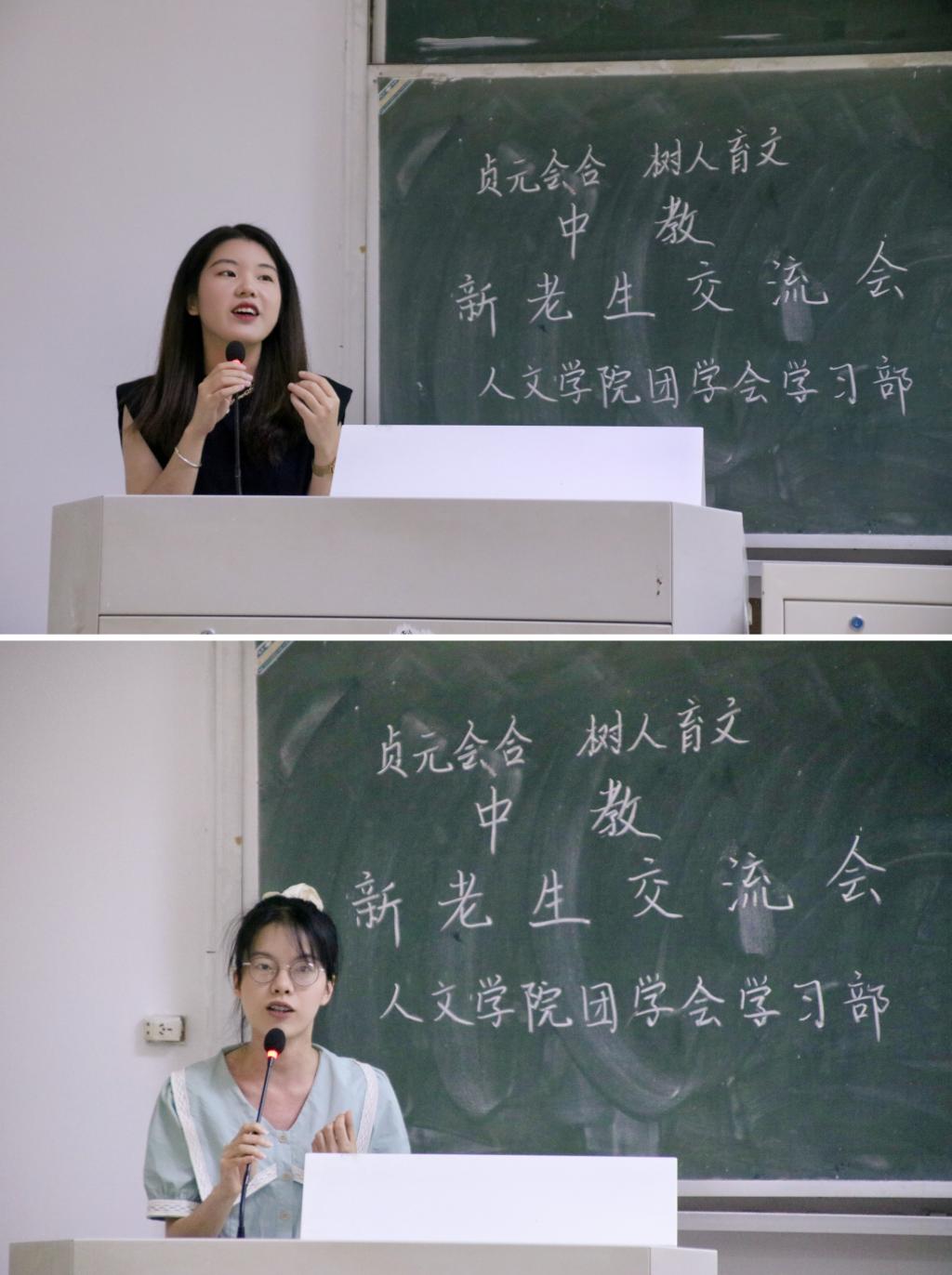 在嘉宾致辞环节中,作为中教专业代表,蔡敏霞以自身失误经历为例,强调主人翁思维的重要性,鼓励中教专业的新生多进行尝试和整理总结,并介绍其情绪调节办法——自己与自己对话,以此方法转压力为动力。王雨楠则以“走出自己的花路”为开头,简要介绍了专业课的注意事项,尤其强调了课上积极发言、课后及时复习的重要性。另外,她们都表示阅读是中教专业必不可少的,鼓励同学们在课余时间广泛阅读。