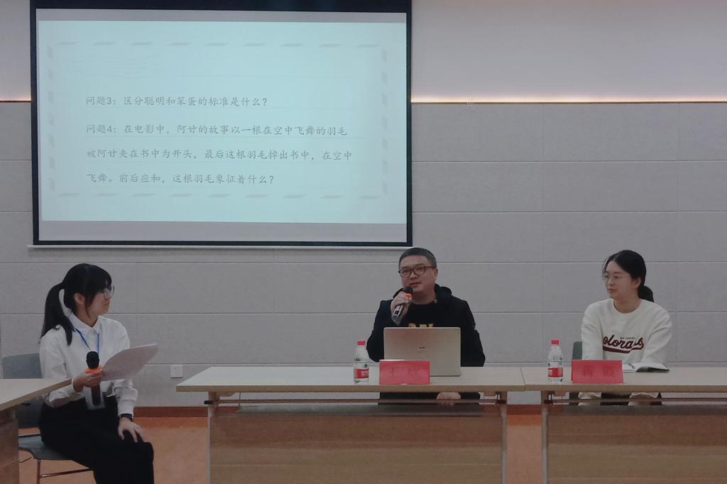 活动伊始,师生共同观看了《阿甘正传》电影的片段,重温熟悉的经典。随后是学生讨论环节,四组同学就电影背景、情节、人物以及观影后的感受展开讨论。同学们概括了阿甘的人物形象,指出了最印象深刻的地方,也提出了对电影人物的不同见解。大家都从阿甘身上感受到深深的韧劲,体会到他对生活的热爱,从而产生对人生观的新理解。