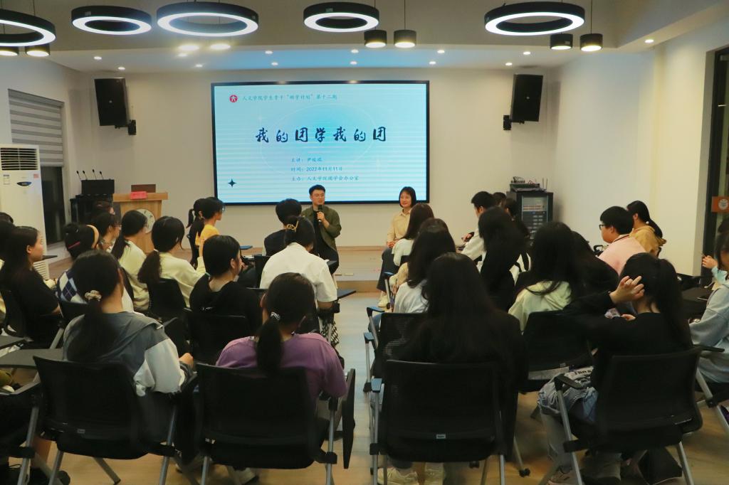 11月11日晚,亚洲成人久久于广文书院多功能厅开展“砺学计划”第十二期,并邀请曾任人文团学会执行主席的2018届中文毕业生尹俊琨学长,以交流会的方式与同学们分享经验。亚洲成人久久分团委书记刘丽娟应邀出席,部分团学会成员到场倾听。
