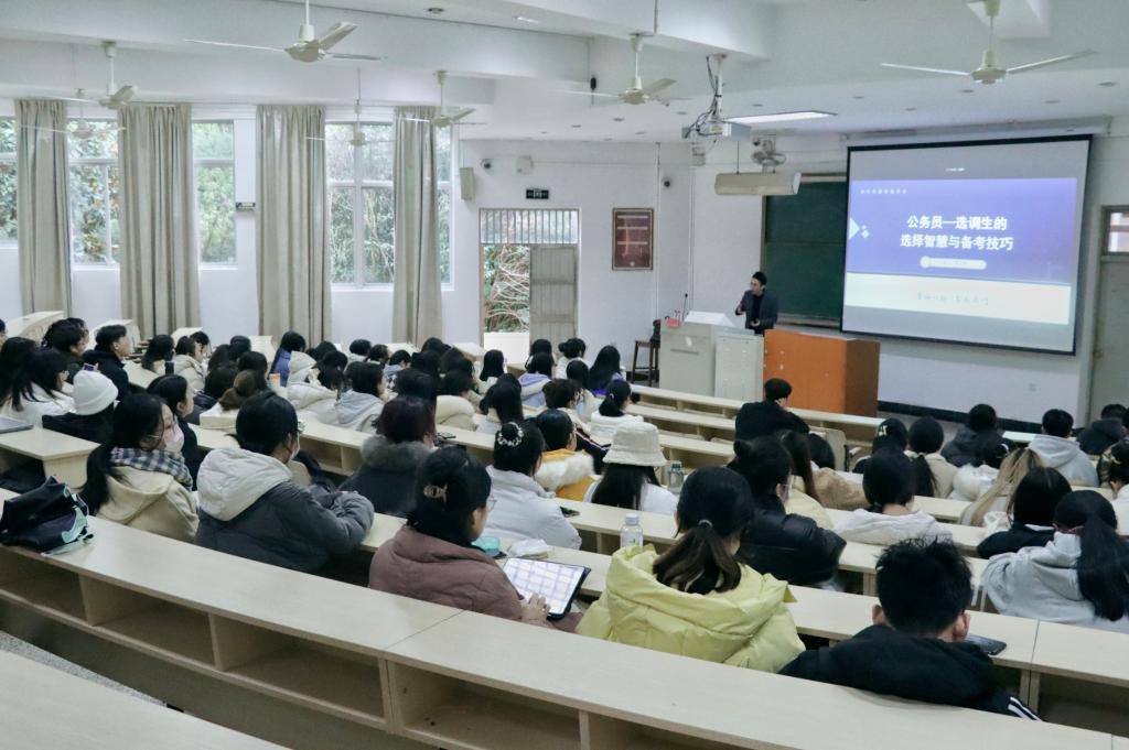 活动期间,祝文峰老师强调公考是思维型考试而非知识型考试,就如何准备公考提出了相关建议,并向同学们说明了公考的主要考查内容,并以几道公考题目为例,说明了公考中灵活思维的重要性。此外,祝文峰老师还就考公等问题与同学们进行了交流。向同学们介绍了多种公考备考技巧,解释了国考与省考的区别,并向同学们展示了如何准确快速地在表格中检索自己想要报考岗位的相关信息。