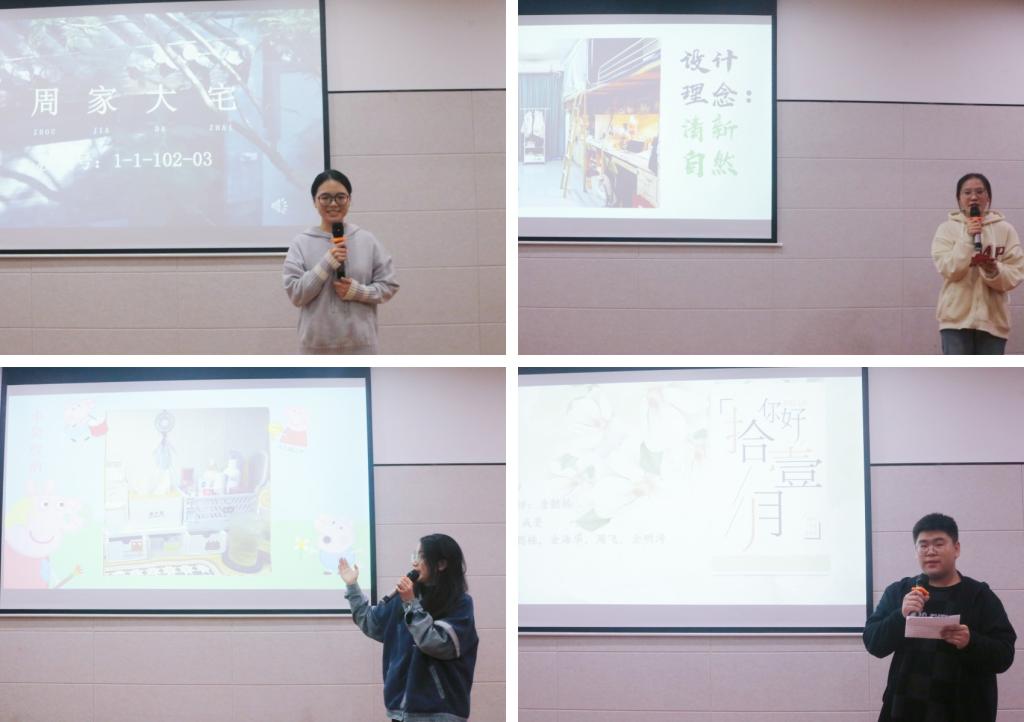 决赛现场,各参赛寝室的代表奇思妙想,采用图片、视频等方式,淋漓尽致地展现了他们的寝室美。其中,1-1102-3寝室以周家大院——“周妈妈和她的三个女儿”的故事为切入口,不仅向我们展示了独特的寝室环境,而且传递了积极向上的生活观——生有热烈,藏于俗常。经过激烈的角逐,1-1102-3寝室获得一等奖,5-2301-2、1-1202-3寝室获得二等奖,1-1602-1、6-3102-2、17-409寝室获得三等奖。杨子吟同学获得个人一等奖,童玉娇、周飞获得个人二等奖,金敏琪、沈烁欣获得个人三等奖。