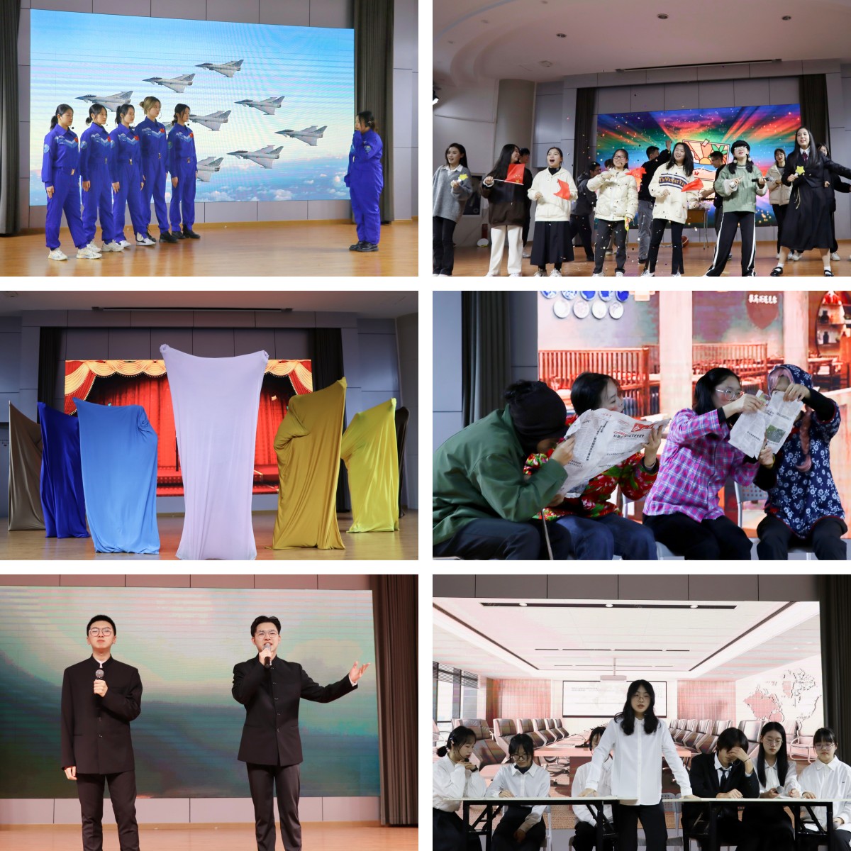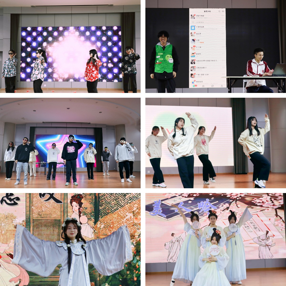 在团学会各部门集体合照、活动剪影视频及班主任寄语视频后,晚会正式拉开序幕。随后,文体部、学习部带来的开场舞《银河歌舞厅》,以舞动的节拍瞬间点燃了全场的热情。接着,团建部带来的《时间都去哪了》和公寓自律委员会的《内卷不绝》小品,以生动有趣的方式调侃当今大学生的拖延日常与内卷现象。媒体中心和教务部带来的《青春有我》,展现了新生们青春靓丽、积极向上的精神面貌。