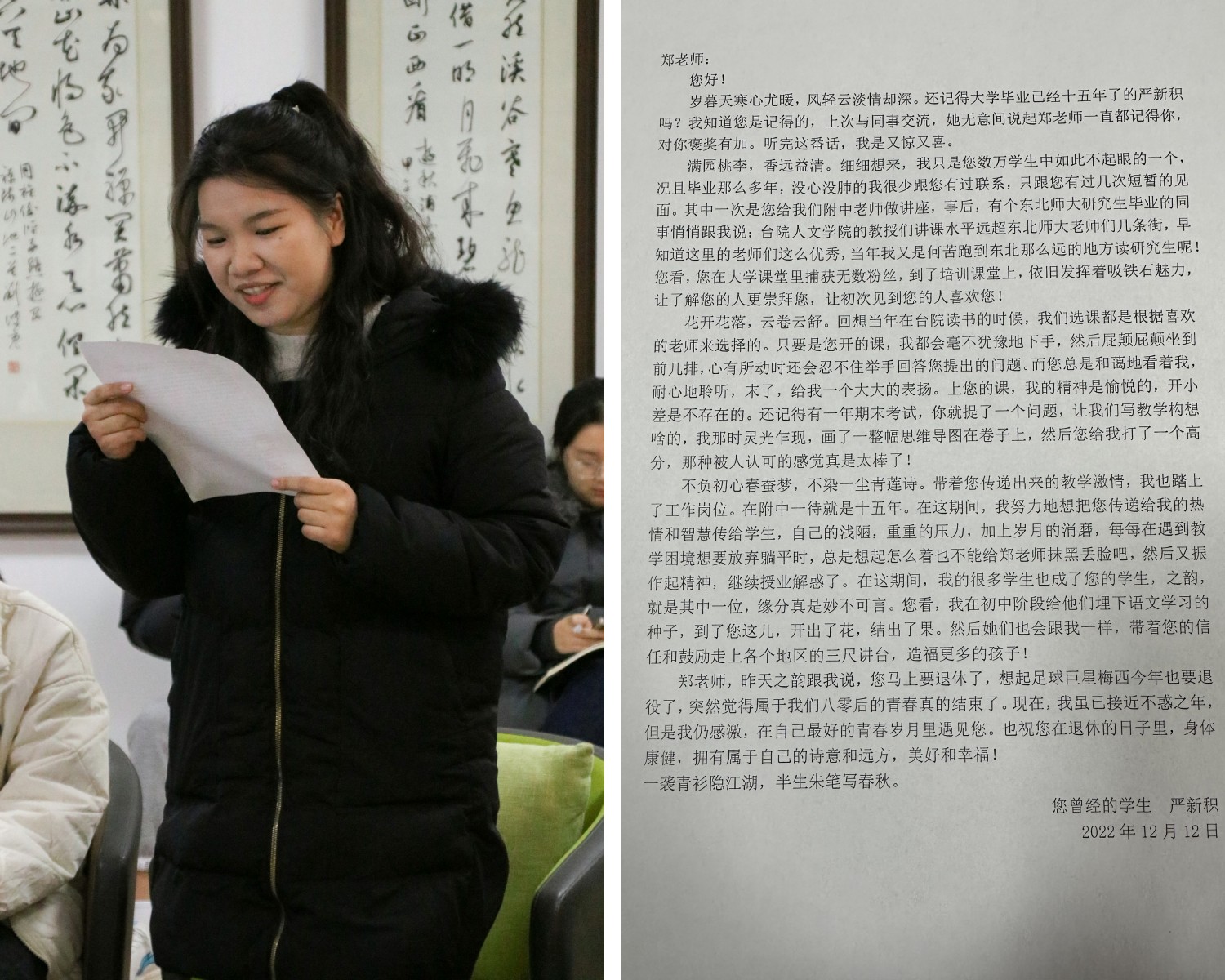 在惊喜环节中,李之韵同学带来了一封特别来信——这是她的初中语文老师严新积,也是郑友霄老师曾经的学生写来的。“在这期间,我的很多学生也成了您的学生,之韵,就是其中一位,缘分真是妙不可言。您看,我在初中阶段给他们埋下语文学习的种子,到了您这儿,开出了花,结出了果。”信中,严新积老师表达了对郑老师满满的感激之情。
