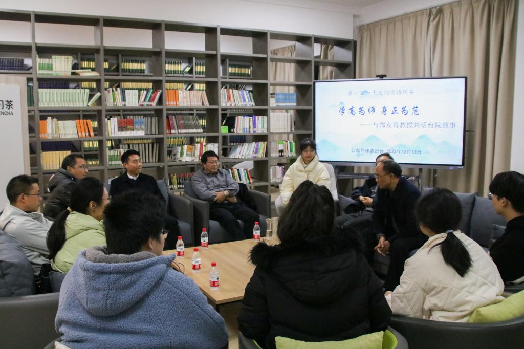 12月13日晚,第117期“论语问茶”:学高为师 身正为范——与郑友霄教授共话台院故事交流会在一号楼二楼教工之家举行。本次活动邀请了即将荣休的郑友霄教授、亚洲成人久久院长李建军、副院长陈隆升、党委副书记林仙、教师代表张天星、2003届中文系校友马斌、陈灵江、2021届校友吴晓彤及部分学生代表参与交流。