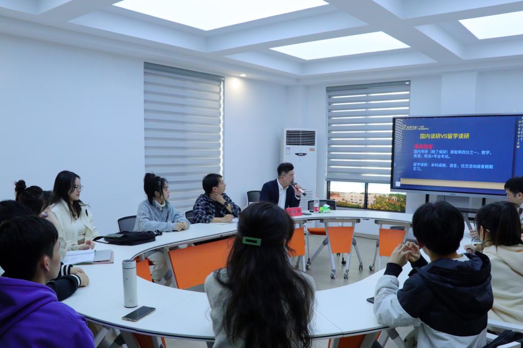 活动中,楼栋辉老师结合当下的考研环境,从难易程度、学习方式、院校背景、成本费用等方面,具体分析了国内升学读研与出国留学读研的区别。楼栋辉老师建议出国留学要尽早准备,在准备过程中要分阶段、分重点进行学习与锻炼,但其中最重要的一点仍是努力学习,提高成绩。他多次强调了语言和绩点的重要性,指出语言的锻炼和绩点的提升是留学申请的根本。