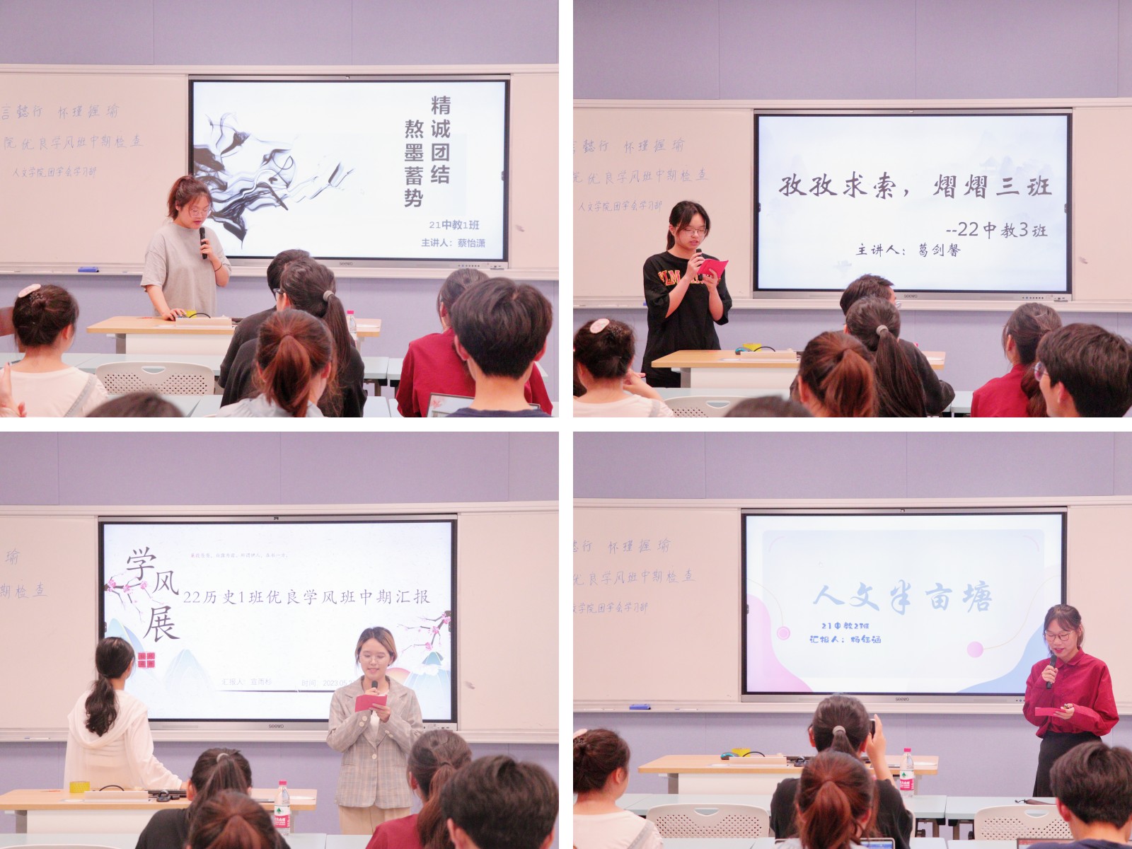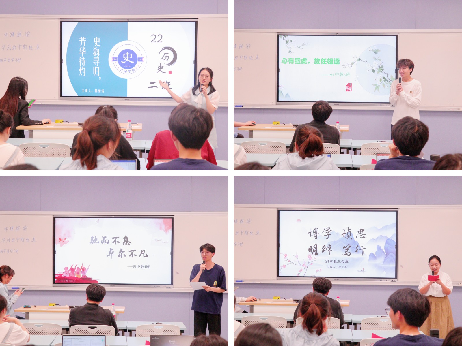 本次学风检查活动分为班级展示和老师点评两个环节。在班级展示环节中,19个申报班级以PPT和视频两种展示形式从班级简介、学习建设、文化娱乐、未来期望等方面进行班级介绍。各个班级轮流进行了展示,他们各自独特的班级文化赢得了观众的热烈掌声。21历史班以北斗七星自喻,将历史文化融入班级介绍;20中教2班、20中文2班和20历史班制作了精彩视频,展现了青春昂扬向上的班级风貌;21中教1班重点突出了自班独有的“精诚团结,熬墨蓄势”的精神。