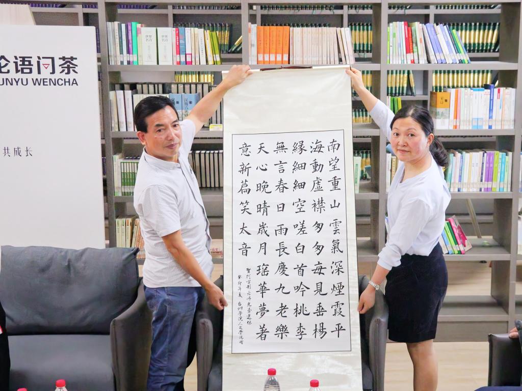 “桃李无言春日雨,长庆九老乐天心。”在惊喜环节中,学生代表朗诵了01中文本科1班俞少春创作的《贺何方形老师光荣退休》这一古体诗,并由罗晨瑜老师向何老师赠送相应的书法作品,以表达对何老师的祝福。