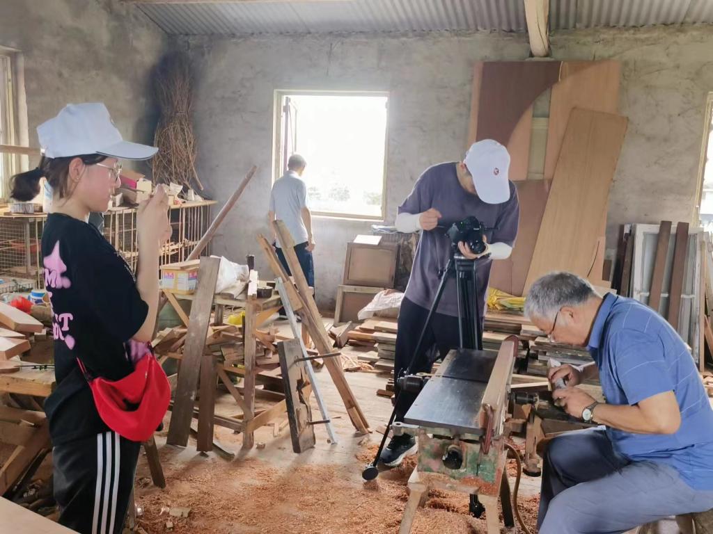 队员们先后拍摄并记录了两位木艺传承人和一位竹编传承人。木艺传承人葛兆国先生最具代表性的作品即《潮涌福临》,作品以榫卯结构为基础制作,寓意兔年吉祥如意,财源如同潮水起,百姓年年享福乐。第二位木艺传承人向实践队队员展示了明清官帽椅和红木沙发,此沙发是仿东阳红木家具而做——对分割好的木材进行划线、刨皮,最后钻洞。