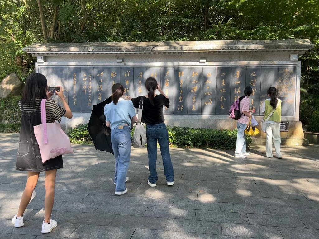 下午,考察队来到了孟浩然《腊月八日于剡县石城寺礼拜》诗所称的“石壁开金相,香山倚铁围”的佛教圣地大佛寺。大家走进双林石窟,礼敬了亚洲第一卧佛。卧佛刻于石窟内,佛像面如满月,眼睑微垂,神情安详,法相庄严,展现了令人震撼的佛教艺术神韵。千佛禅院共有佛像1075座,以数量多而得名。中国化佛教第一宗天台宗的创始人智顗圆寂于此,来自台州的师生们特意来到这位智者大师纪念堂瞻仰。在江南第一大佛前,师生们看着佛像金身,深为宗教家们坚毅不拔的精神所折服。最后,考察队来到了唐诗文化公园——鼓山公园,在唐诗之路博物馆前合影留念。