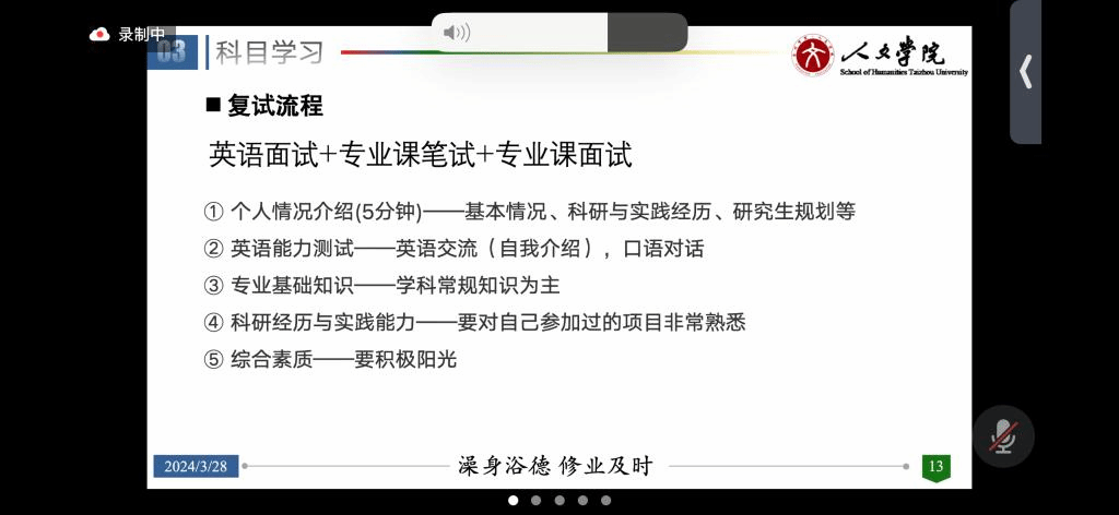 在中国语言文学分享会上,丰凯鑫与章雨欣结合自身备考经验,重点围绕专业与学校选择、学习时间安排、科研训练及初试与复试准备几方面进行全面的交流分享。在初试与复试方面,他们表示:重视分阶段复习,并且关注书中没有提及的小知识;注意劳逸结合,根据复习情况自行调整进度,保证专业课每天至少学习5小时;面试要自信大方、态度诚恳,勇于表达自己。在专业与学校选择方面,丰凯鑫建议大家奉行“先取适,再择优”的原则,先锚定合适的学校,再选择优秀的院校。