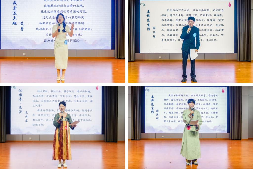 在紧张刺激的个人朗诵环节,选手们需要随机抽取相关篇目。所有选手都以最饱满的精神姿态朗诵了篇目《五柳先生传》《沁园春•长沙》《我爱这土地》和《我与地坛》。