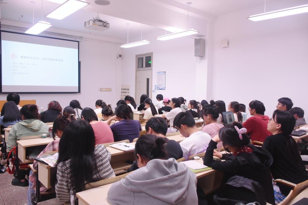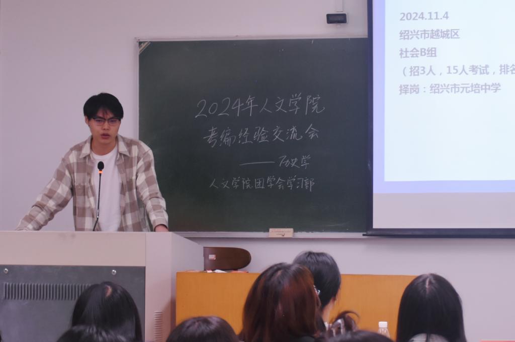 活动伊始,何童舒分享了自己上岸教师提前批的经验,提出了宝贵建议,并以部分地区面试形式为例讲述面试技巧,如化用名言提供论据,并掌握试讲和结构化的面试形式;何子怡着重指出,考生应首先明确自己想要报考的地区,并分享了保持良好心态、提前适应教材等应试经验。随后,褚骁阳详细介绍了考编时间及流程,并从自身考编经历出发,以报考越城区初中社会岗位为例,为同学们分析考试形式、内容等关键信息。