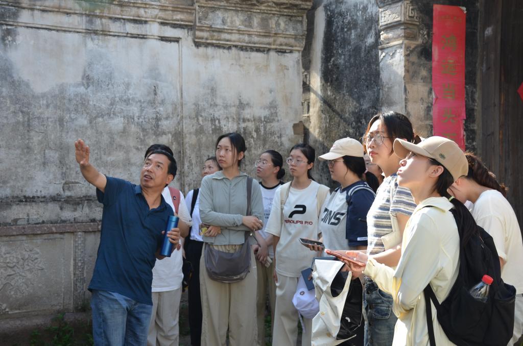 本次实践队的第一站,队员们跟随何老师来到洪颐煊故居及三井巷陈宅。洪颐煊是清代学者,他帮助阮元校编著名的《经籍纂诂》,负责分纂《释名》《小尔雅》,并且参与编韵,又根据孙星衍所藏碑刻铭文,详加考证,撰写了《平津馆读碑记》十二卷。今洪颐煊故居是他的后裔在“小停云山馆”西边朝西的三间小轩基础上扩建的。故居的主体建筑布局精巧,藏而不露。通过讲解,队员们了解了许多古代建筑中蕴含的意义:例如照壁谐音“避”,寓意避开祸患,它在战乱年代也起到防盗的作用;不同人家门前的台阶也有讲究,商人门前只有一级台阶,寓意“一本万利”,而读书人门前有三层青石台阶,寓意“青云直上”……庭院的每一处转折都让队员们对古代建筑有了更深刻的理解。在何老师的讲述下,队员们还探寻了几百年前洪颐煊在巾山下的读书时光。洪颐煊校编撰写过程中严谨的学术态度和以实证为基础的精神也启示着队员们知行合一,学以致用。