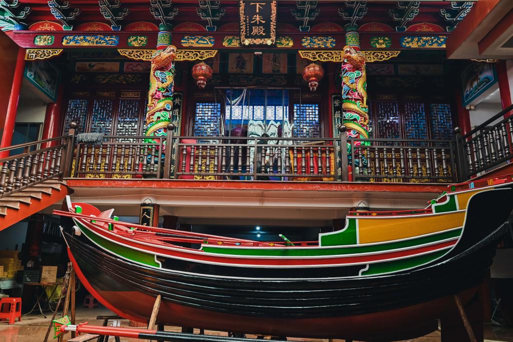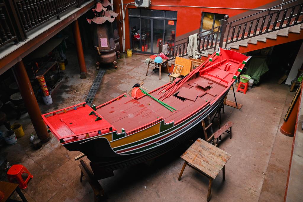 上午,实践队员们沿着小巷,寻找到了临海市杜桥镇“大暑船”所在地——下朱殿。一进门,队员们便看到了停靠在殿宇中间空地处的“大暑船”。“大暑船”刚完工不久,上面的漆色泽鲜丽,做工精致,造型工整,工匠用时两个多月精心打造。殿宇里的人用水冲洗整个寺庙,目的是为了洗去尘埃,有健康平安之意。
