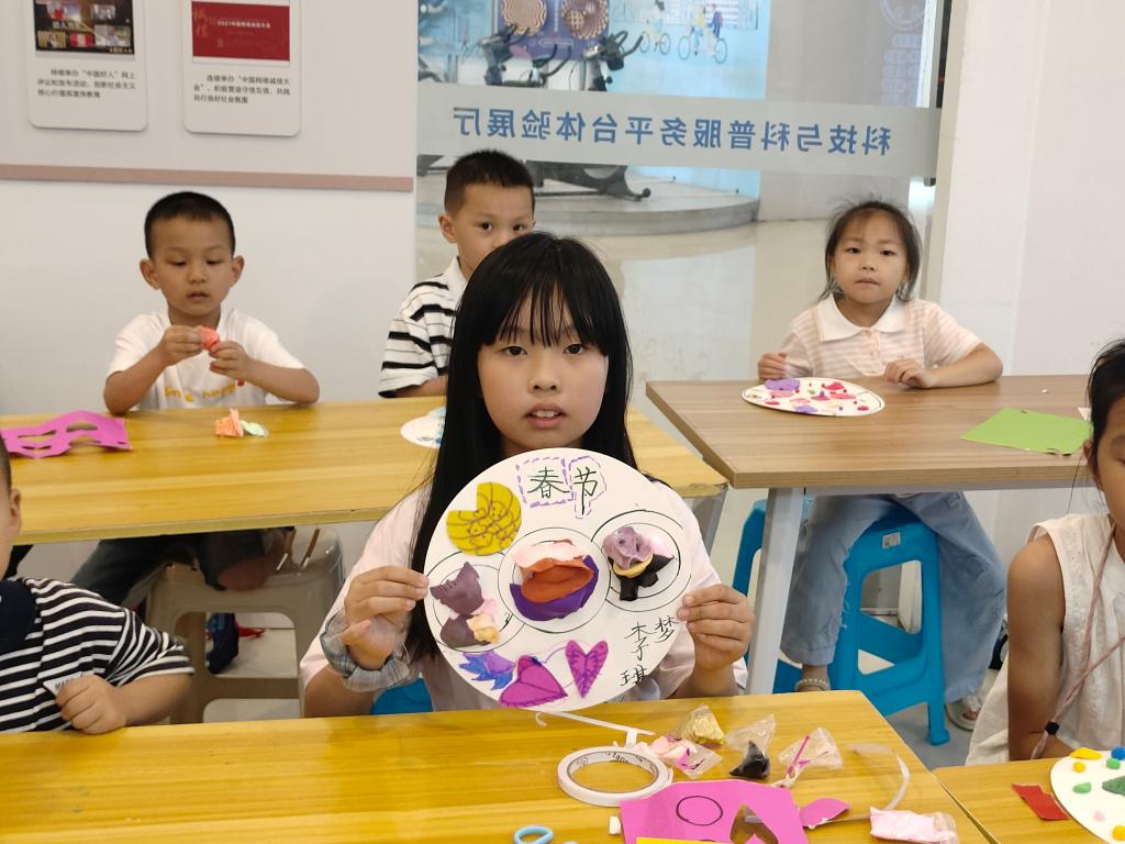 为了加深和巩固孩子们对传统文化的认识,实践队组织了一场以传统节日为主题的贴盘画创作活动。孩子们充分发挥创造力和想象力,运用黏土、彩色卡纸、马克笔等材料,完成了一幅幅充满传统节日气息的贴盘画。通过这次体验,也为他们埋下了热爱传统文化的种子。