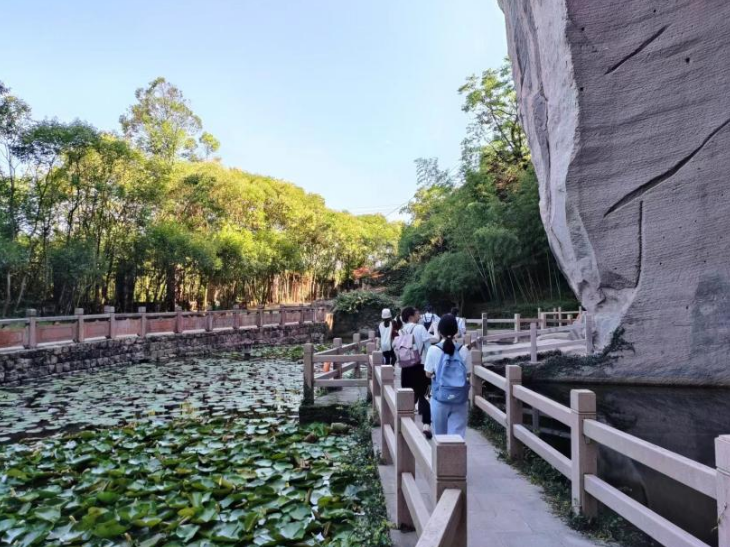 7月6日上午,实践队前往琼台仙谷进行实地考察。通过文化溯源,成员梳理出琼台仙谷的宗教文化、生态文化、诗词书画文化等文化类型。在实践过程中,团队发现琼台仙谷存在部分景点解说较少、部分碑文字体磨损、景点旅游业态较为单一等问题。在研讨过程中,团队创造性地提出将乌药、黄精、艾草等草药文化纳入琼台仙谷所在的“宁康”主题旅游线路,并对区域性的山海联动提出相关方案。