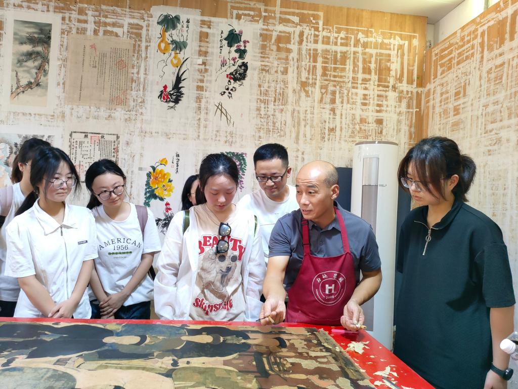 7月7日上午,实践队抵达田市镇。田聚物华,市汇天宝。田市镇,又名“云田古镇”,有云田之上集市的美誉,早在明代就已立市,曾是仙居历史上最重要的古集市之一。队员们首先来到云田古街街区,街区内建筑古朴,民居还留有上世纪的标语口号,历史气息浓厚。不多时,队员们陆续游览了九思回廊、思源井和吴芾纪念堂,并深入柏楠书画装裱研究院,倾听院长吴建江为大家介绍书画修复与装裱的工艺流程。在吴院长的躬身示范下,队员们了解了机器修复与传统手工修复的区别,理解了这项非遗手工的重要性。