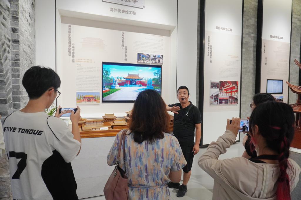 实践队一行抵达博物馆后,便被博物馆前一座高达20米的斗拱雕塑深深吸引。这是汇溪镇的主题镇标,雕塑整体呈现解构变化的形象,寓意传统古建技艺及文化在发展的过程中,所具有的各种可能性和强大的生命力。