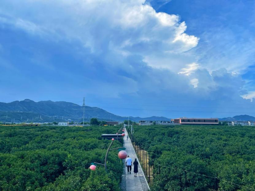 接着,实践队一行移步空中栈道,俯瞰凤洋村广袤的柑橘采摘园。在柑橘品种园,彭书记为实践队成员详细介绍了黄岩柑橘的多种优质品种,从本地早到葡萄柚,每一种都有其独特的口感、色泽和营养价值。听完介绍,队员们对黄岩柑橘品种的多样性与品质优势有了更加深入的认识。