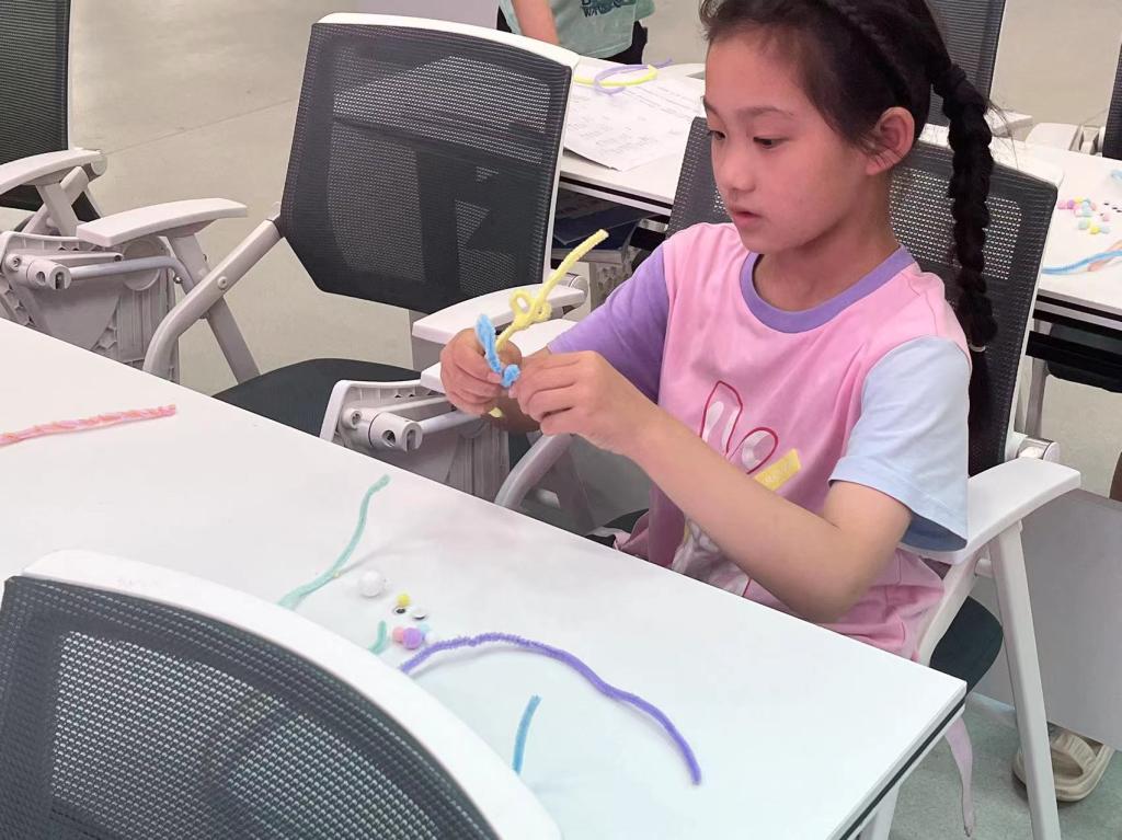 指尖轻舞,编织出绚烂的色彩与独特的形状。原本平平无奇的扭扭棒在孩子们的手中,或为爱心,或为星辰,或为蝴蝶……孩子们化身小小魔法师,用扭扭棒编织出属于他们的世界。在这个过程中,他们之间的交流也如同流淌的溪水,在碰撞与交流中奏出一支独特的乐曲。“你教我花朵怎么做吧。”“借我一下剪刀可以吗?”孩子们在实践的过程中不仅仅提高了自己的动手能力,更学会了互帮互助,互相欣赏、互相学习,共同在艺术的海洋中遨游,笑声、赞叹声、讨论声交织在一起,编织出一幅动人的青春画卷。在充满创意与想象的土地上,孩子们用心去感受、体验、创造,以自己的方式诠释着艺术。