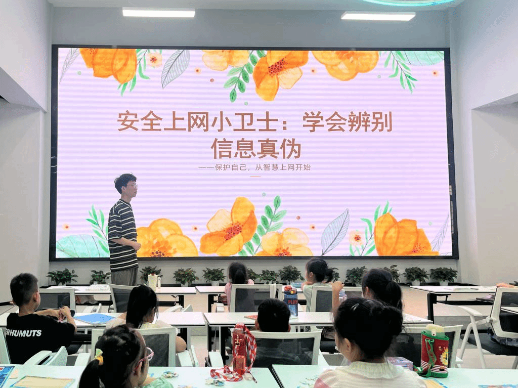 在这个信息交织、数据奔涌的时代,为了提高孩子们对于网络信息的辨别能力,使他们能够在网络的海洋中畅游无阻,实践队设置了网络信息真伪课堂,通过介绍各种网络信息、结合典型案例,告诉孩子们该如何分辨网络信息的真伪以及对待各种信息的不同方法。课堂上,小朋友们认真听讲,积极回答问题,表达着自己的观点与看法。网络安全课堂的设置为孩子们在数字世界的航行指引方向,它不仅是知识的传播者,更是智慧的播种者,在孩子们心底种下网络安全的小小种子,共同守护数字天空的蔚蓝与美好。