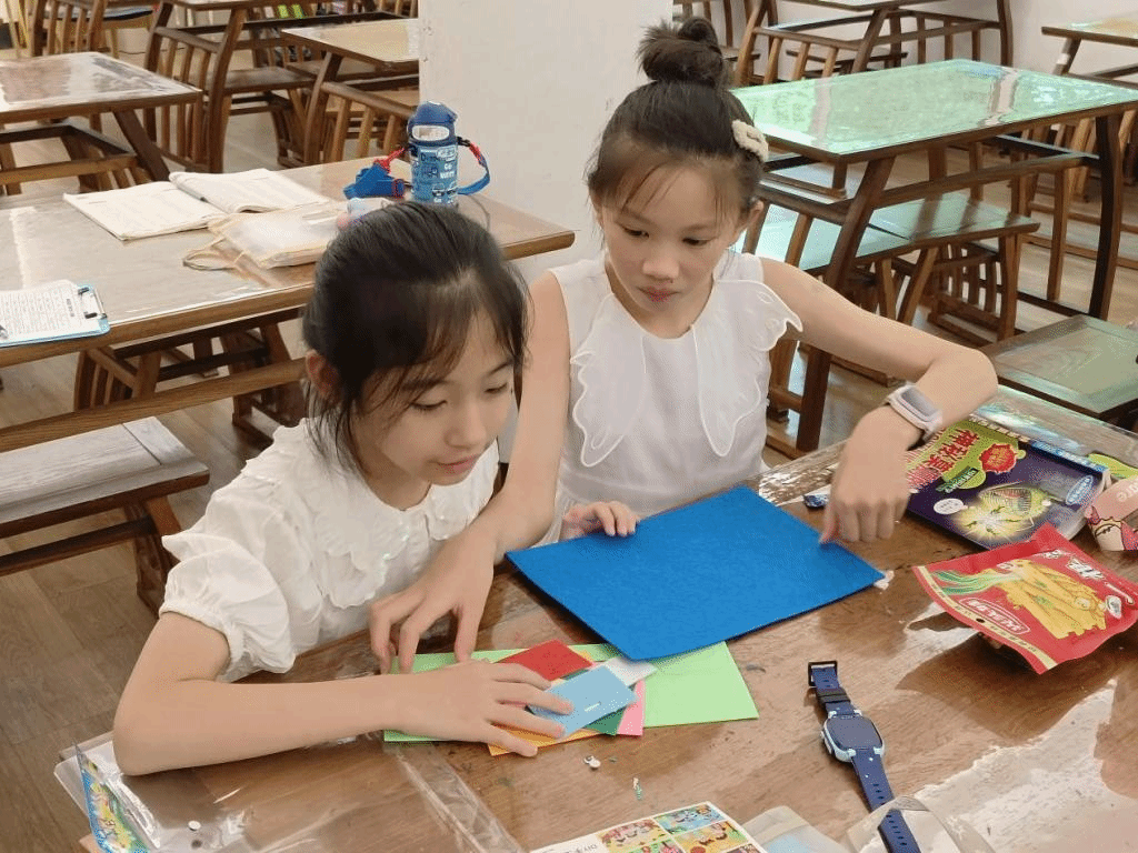 午后,孩子们体验了创意不织布贴画手工。孩子们两两一组,分工协作,五彩斑斓的不织布在孩子们的手中仿佛有了生命力,经过他们的巧手,一件件精美的不织布作品孕育而生。整个教室充满了欢声笑语,孩子们在动手制作的过程中体验到了手工创造的乐趣和成就感。